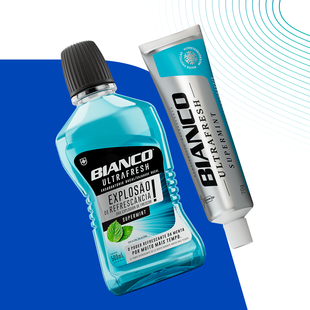 O Creme Dental Bianco Supermint oferece uma solução sem flúor, preservando a saúde dos seus dentes de forma suave e natural, enquanto o Enxaguante Bucal Bianco Supermint, livre de álcool, revigora sua boca com um frescor duradouro, mantendo seu hálito sempre refrescante.